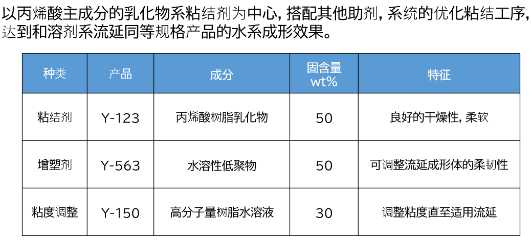 陶瓷的流延成形应用广泛,中京油脂研发了水系流延的系列产品,特点和适用范围如下: