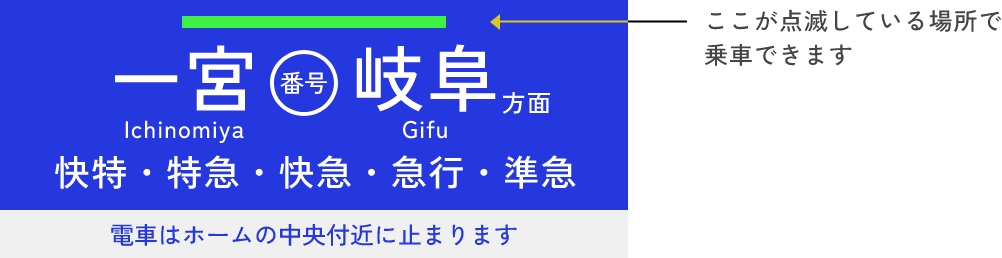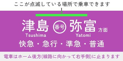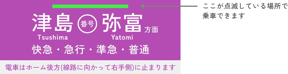 ※紫色の行先表示板が点灯している位置に電車が止まります
